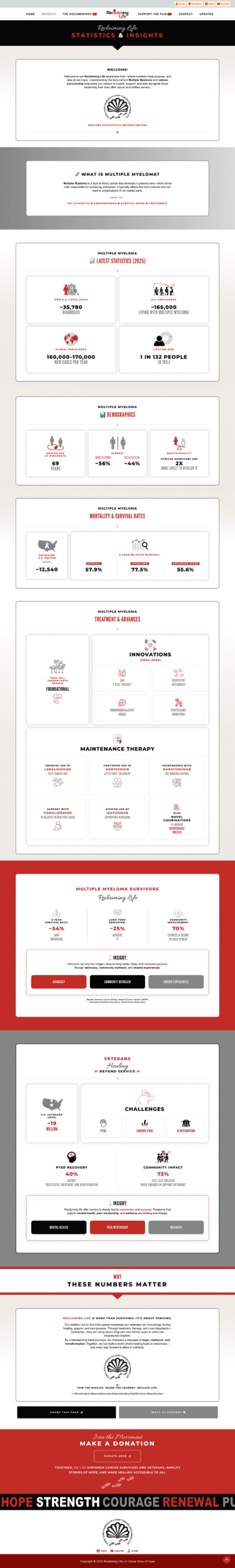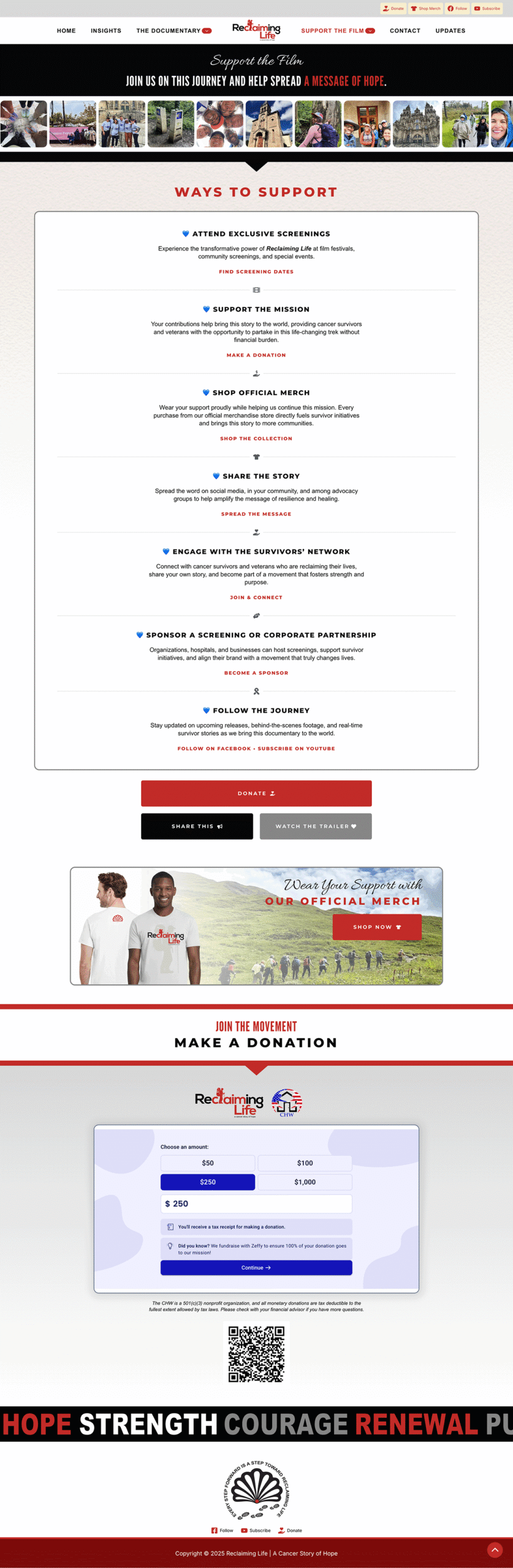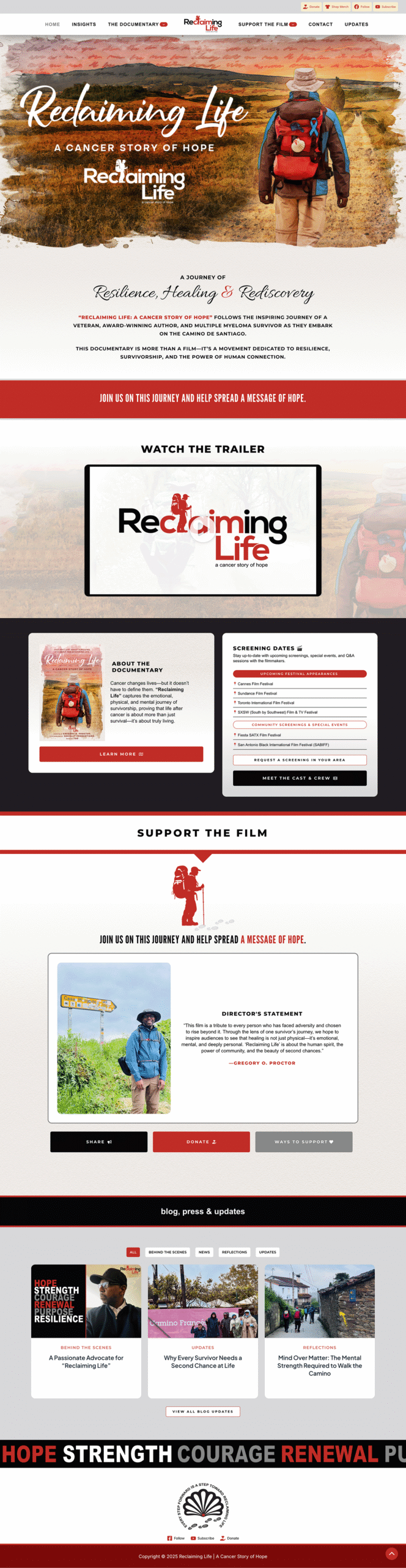 Reclaiming Life: A Cancer Story of Hope is a documentary film project centered on resilience after cancer, the healing power of movement, and the human connection found along the Camino de Santiago. The website was designed to support the film as both a cinematic experience and a mission-driven platform—inviting visitors to watch the trailer, explore the story, meet the filmmakers, view insights, follow updates, and support the movement through donations, screenings, merch, and community engagement.